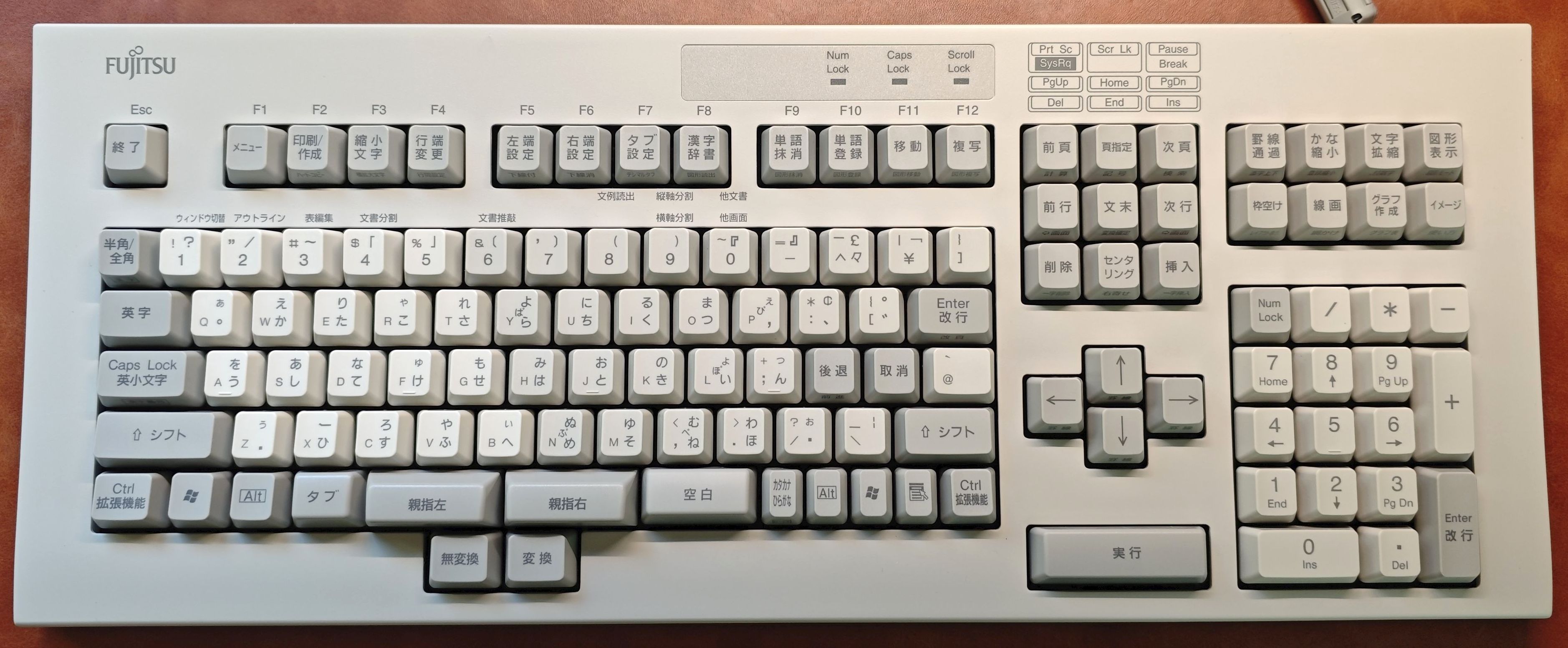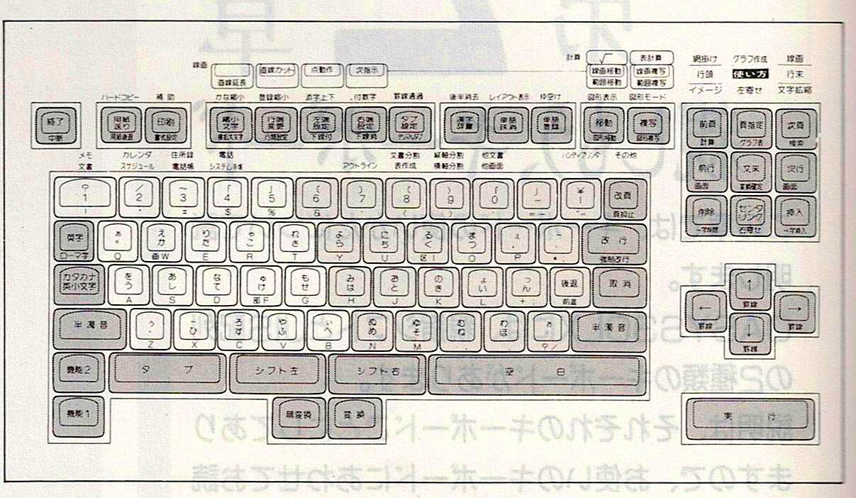 OASYSラップトップ・ワードプロセッサー専用機-LX30のキーボードはテンキーレス。十字キーのあたりは3列だった。75パーセント相当かな。「ctrl」キーあたりに「機能1」「機能2」というキーが2段になっていてこれに合わせてファンクションキーでいろいろな機能を呼び出す。最初こそマニュアル見ながら搭載されている機能を、それこそカルクや図表呼び込みなどを使ってはみたけどそのときだけ。文字装飾も網掛けなども試しはしたが、常用はしない。印刷を考えると罫線引くのも大量にインクリボンを使うため抑制的になるしで、まあやり方というか呼び出し方も忘れてしまう。が、親指シフトキーボードにはこの後フルサイズでFMV-KB613というものも作られているのだが、これはOASYS専用機能キーが復活している。機能がファンクションキーにプリントされ、エンターキーは小さくなってしまうしで慣れではあるんだろうけど残念な感じだった。