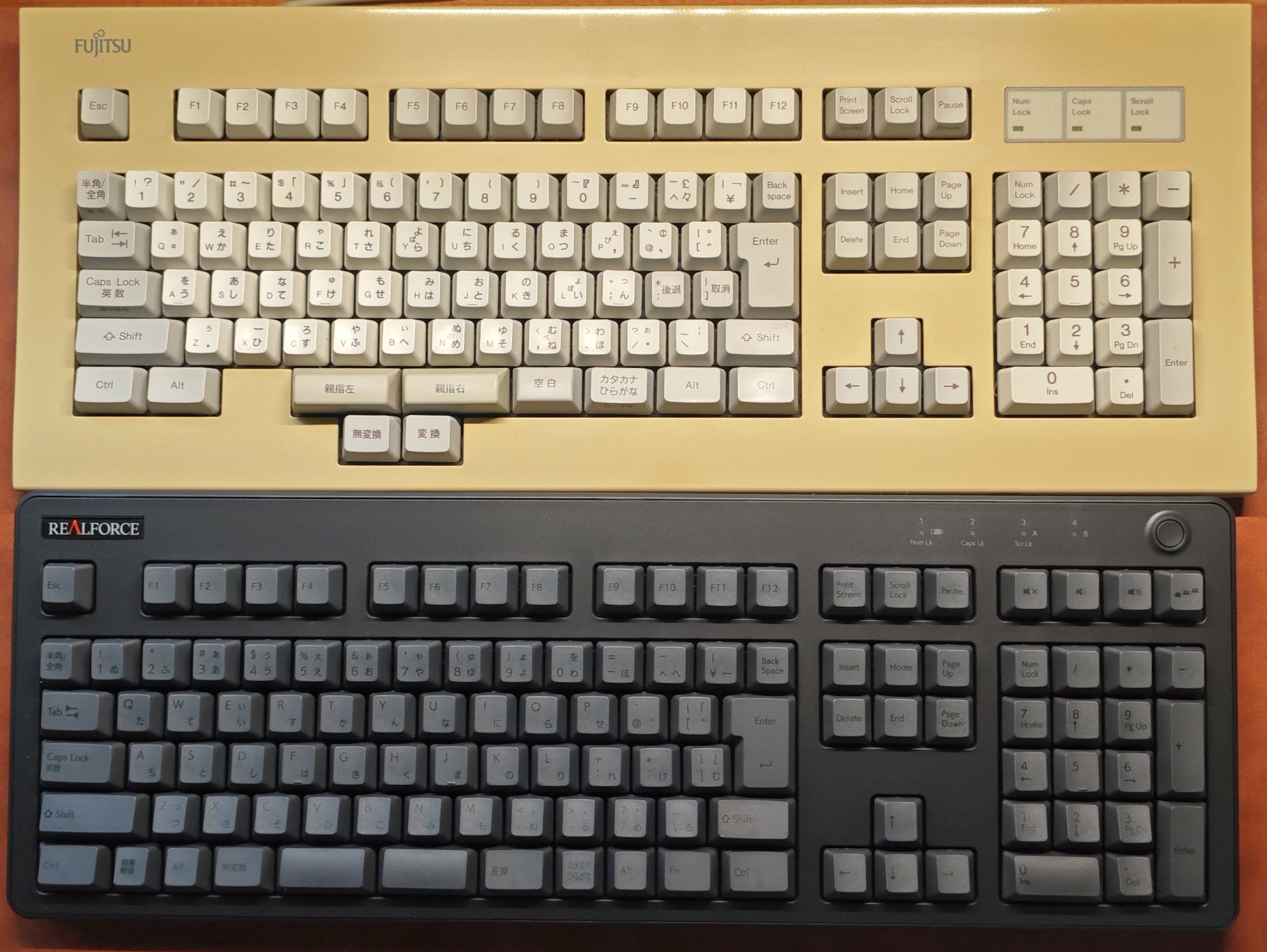上が1996年製FMV-KB211で下がRealforce R3HI17。カナ文字キー表記以外はエンターキーを含めてかなり形状も表記も似ている。「ctrl」キー段の構成は多少違っている。スペースバー下の変換、無変換が大きく違う。とはいえ古のワードプロセッサー専用機では中央に置かれていたりもした。単文節変換では便利だったし。
